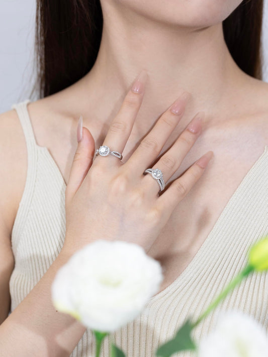 Cacestone Moissanite は、モアッサナイト エンゲージリングのさまざまな選択肢を提供しています。素材は 14k ホワイトゴールドと 925 スターリングシルバーに分かれています。同時に、さまざまな形状に加えて、オーバルカット形状、ラウンドカット形状、ハローカット形状、プリンセスカット形状などがあります。さまざまなカラット、0.5 カラット、1 カラットのモアッサナイト、2 カラットのモアッサナイト リングを選択できます。その他のスタイルについては、こちらをご覧ください。