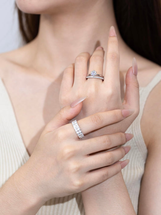 スターリングシルバー 1.7 CTTW モアッサナイト 6mm ダブルロウ フルウェディングバンドリング